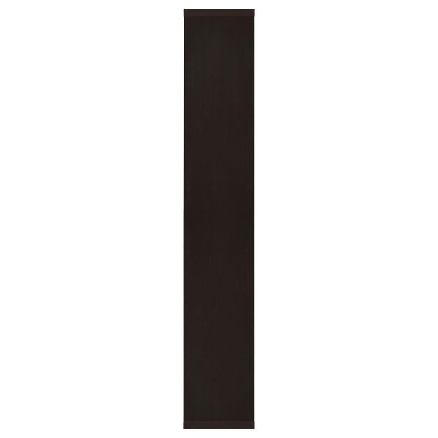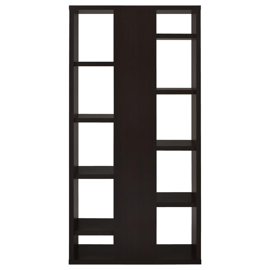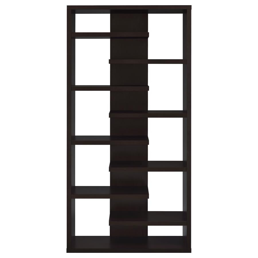 Integrated shelving blends style with substance, making this bookcase a tremendous find. Linear design elements stagger to create a fresh, fun silhouette. With a cool cappuccino finish, it blends beautifully with a number of palettes. Increase storage and display options in a contemporary room with this tasteful piece. Display books, art, decor and even potted greenery.Options and Dimensions