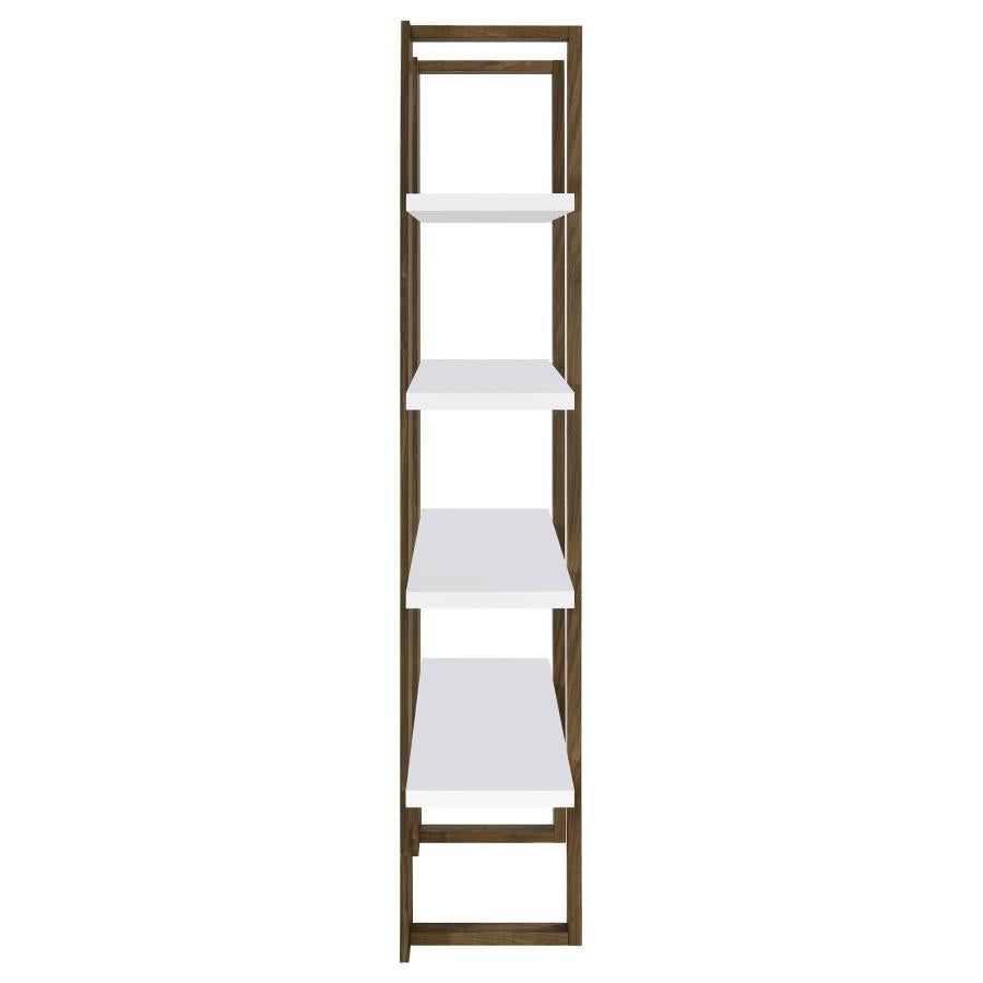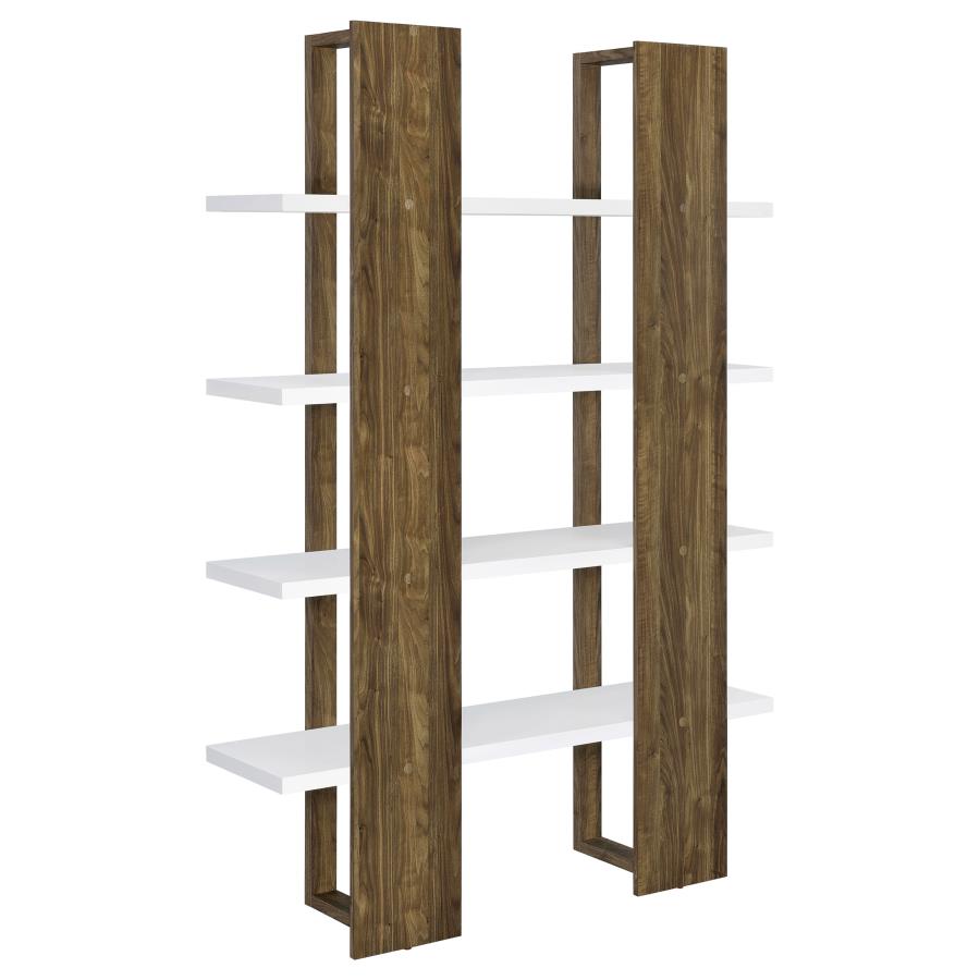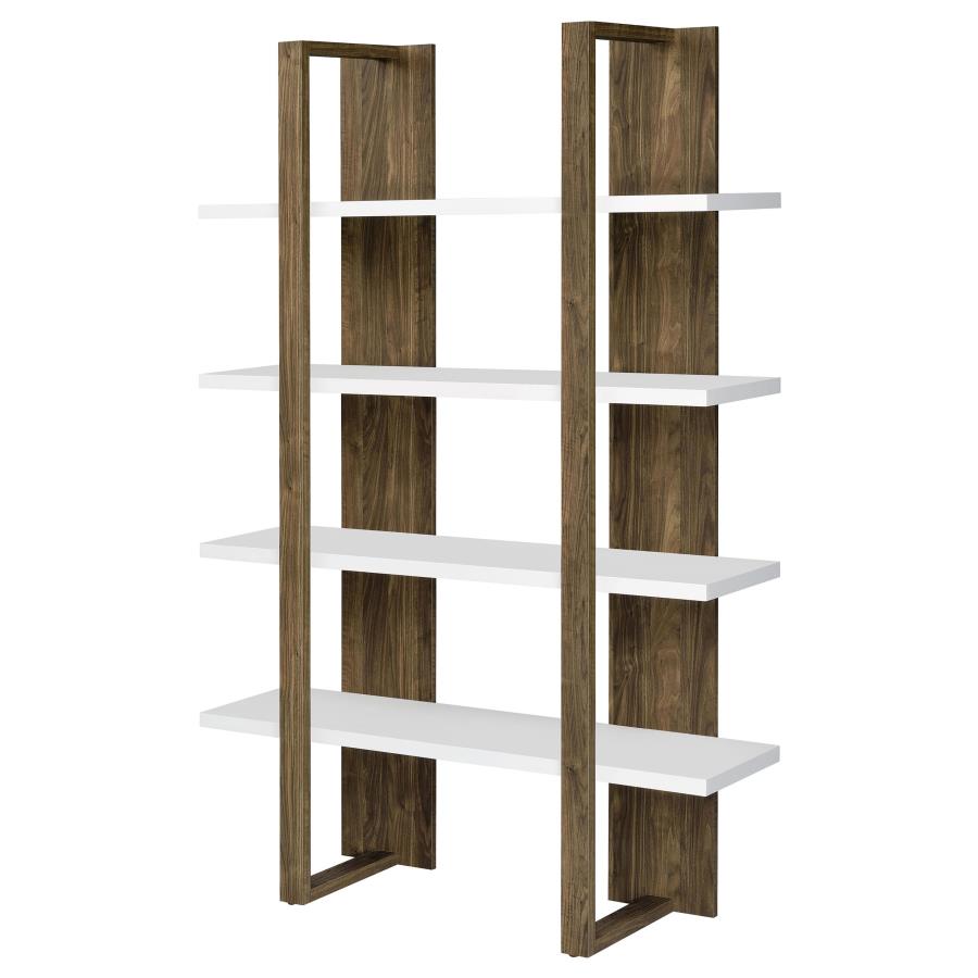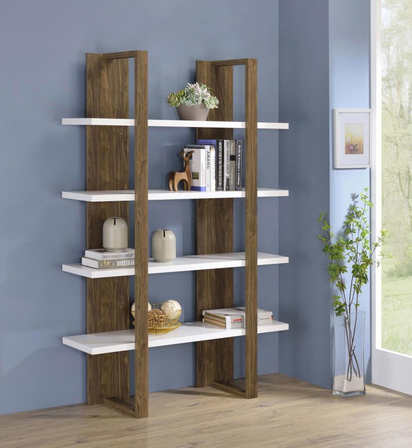 Clean lines and a floating style elevate this contemporary bookcase into a truly stylish furniture piece. With an elegant two-tone finish, this bookcase features an open and airy shelving design with four spacious full-length shelves to display decor, family photos, and more. Each shelf appears to float above one another, enveloped and held in place by a sturdy bracket-inspired frame. Each shelf also extends past the frame, lending a streamlined effect. Available in three different two-tone color combinations, choose the bookcase finish that pairs best with your existing color palette and home decor.Options and Dimensions