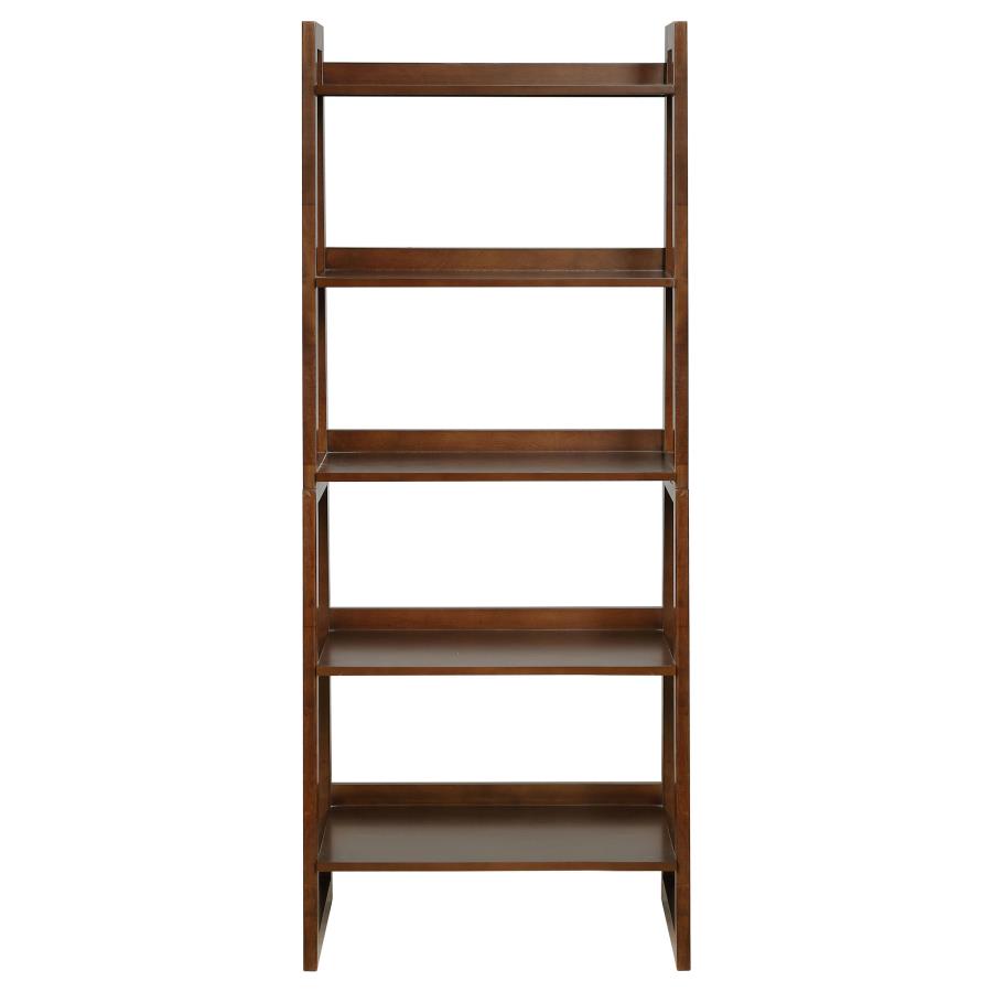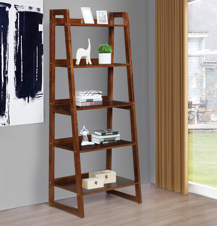 Make a statement with this stunning bookcase. Five storage shelves keep your book collections neatly organized. The open design of the angled frame gives it a geometric appearance. A lovely ladder style bookcase, this piece is ideal for modern offices and living areas. It's supported on a sturdy platform base to keep your books in safekeeping.Options and Dimensions